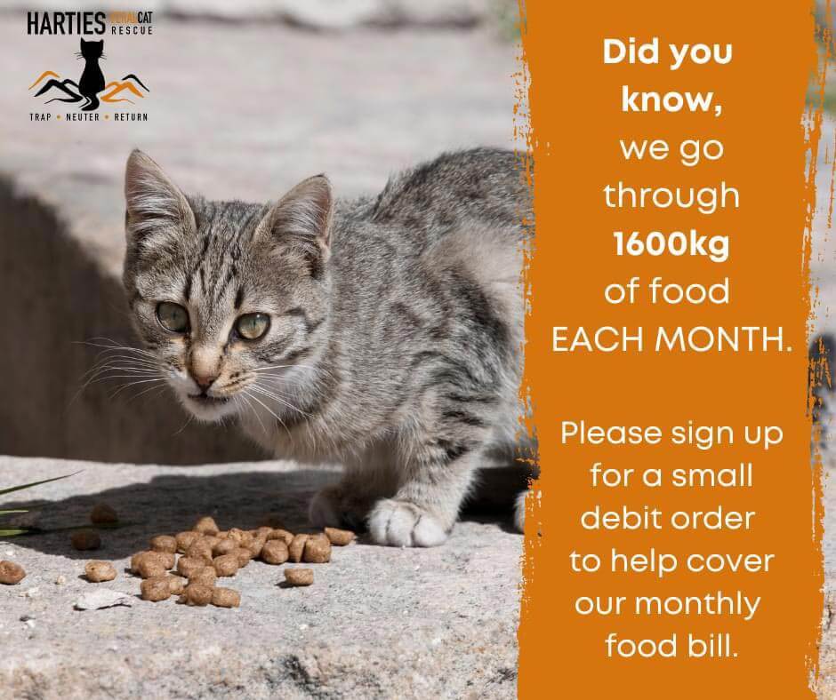 Email: admin@hartiesferalcats.co.za to sign up and help change the lives of these beautiful cats and help us to keep their tummies full.